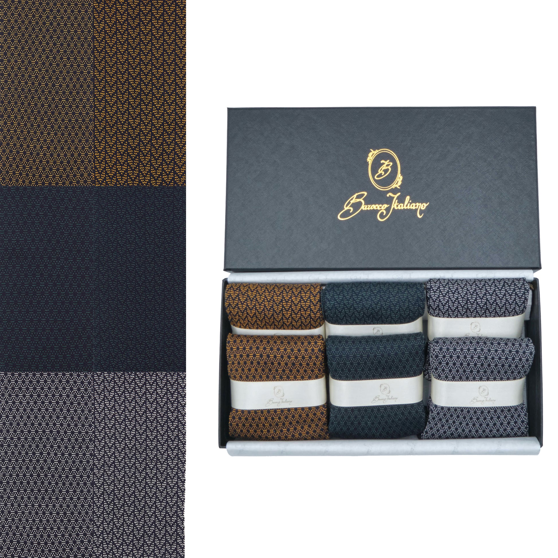Box 6 paia colorate calza lunga Filo di Scozia Spigato e Principe di Galles con polsino inglese - Marrone ROVERE Verde scuro LARICE Grigio CENERE