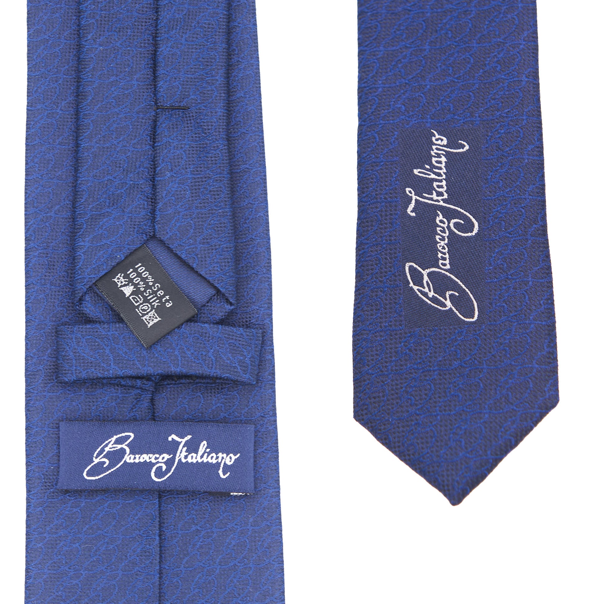 Questa cravatta nasce da un tessuto in seta italiana realizzato su disegno esclusivo Barocco Italiano: un logato blu profondo, discreto ma riconoscibile, pensato per chi pretende eleganza senza esibizionismi.