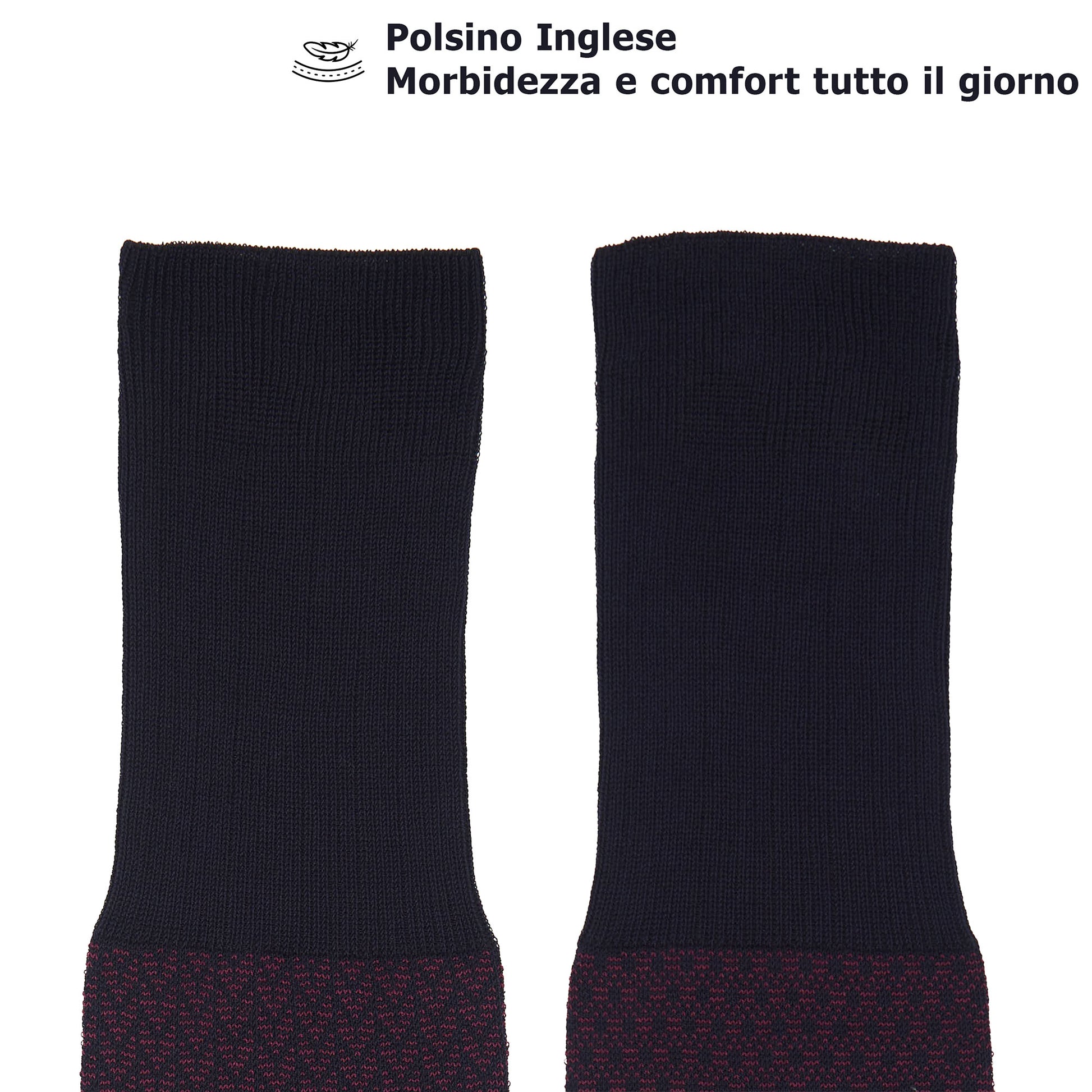 Calza che cade lungo la gamba, scomoda dopo poche ore Il polsino inglese sostiene il polpaccio e non cade mai: comfort totale tutto il giorno
